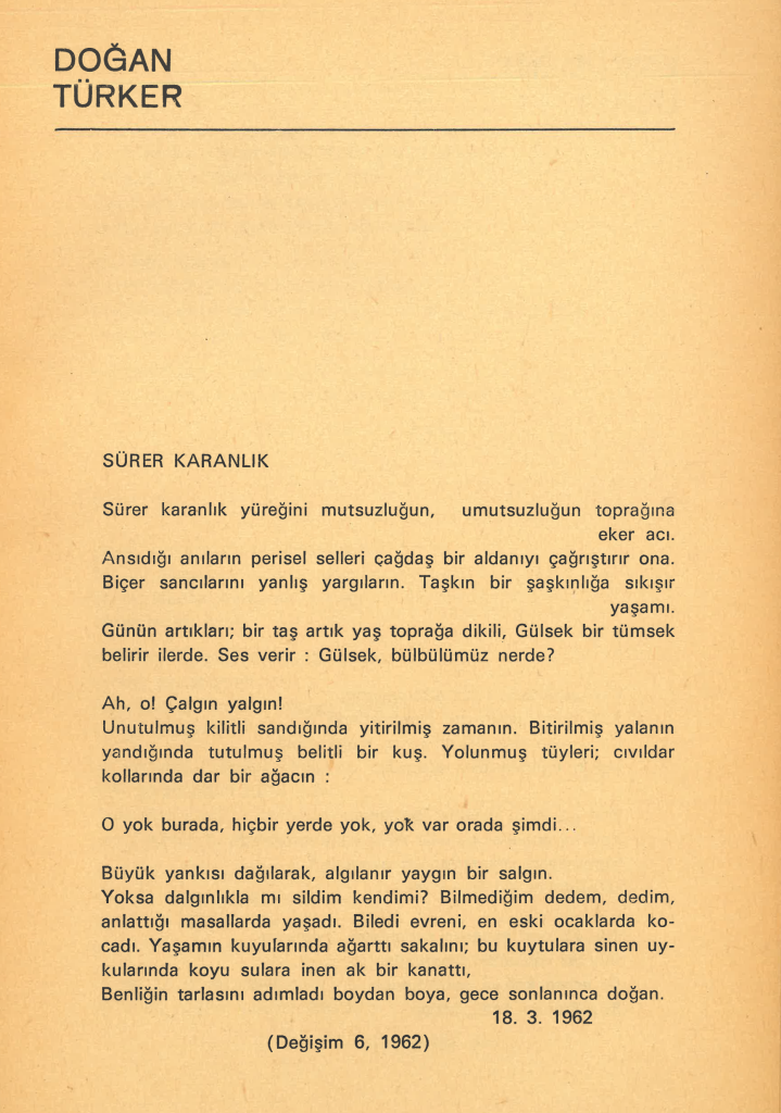 Aradan geçen 57 yılın ardından, bu kıymetli sayfanın tozlu raflarından Doğan Türker imzalı “Sürer Karanlık” şiirini gün yüzüne çıkarıyoruz.